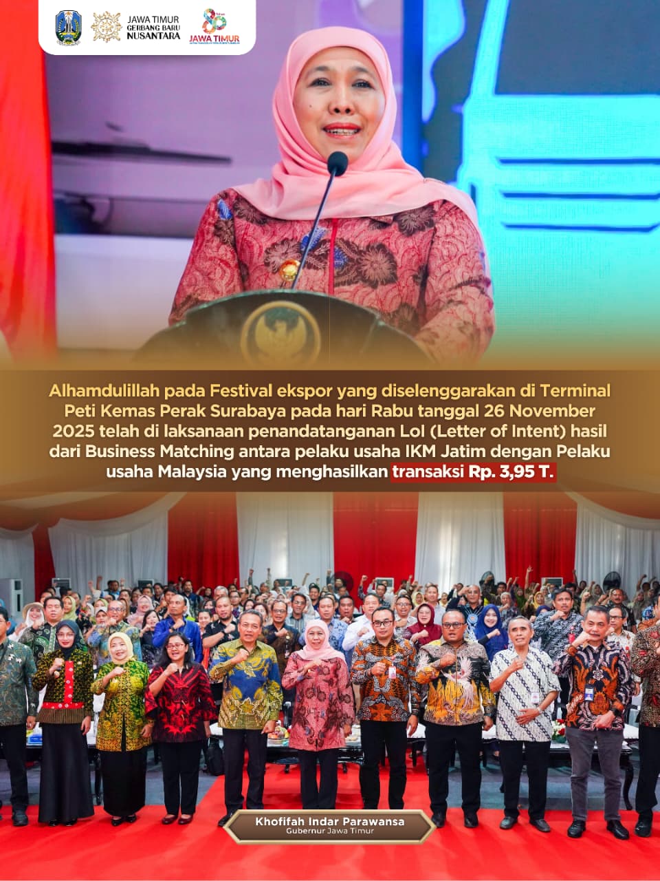 Media Bangsa – Sebanyak empat pelaku usaha Jawa Timur menandatangani LoI (Letter of Intent) dengan Atase Perdagangan Malaysia dalam rangkaian Festival Ekspor Jawa Timur Tahun 2025 di PT. Terminal Petikemas Surabaya, Rabu (26/11).