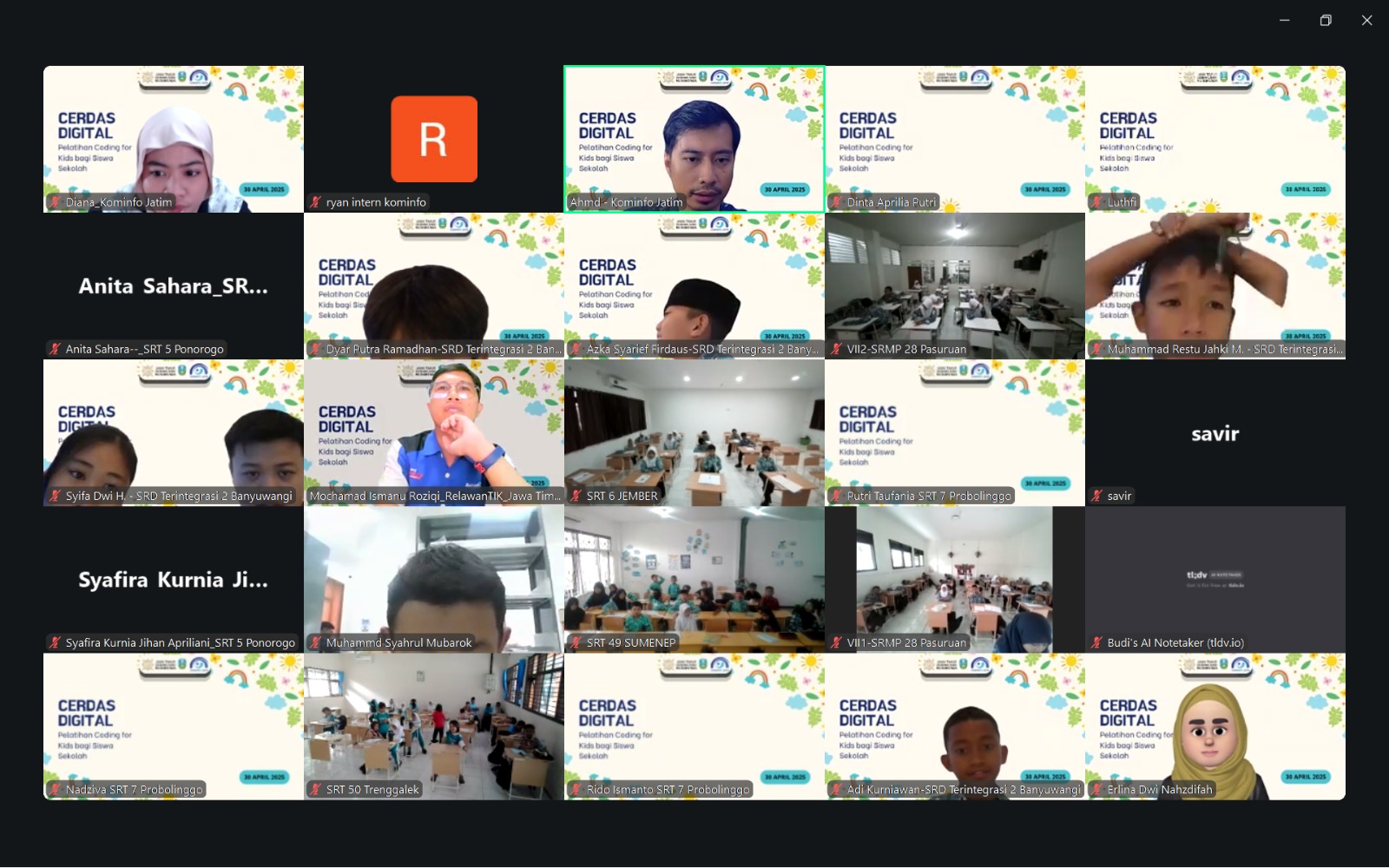 Media Bangsa – Dinas Komunikasi dan Informatika (Diskominfo) Provinsi Jawa Timur terus memperkuat literasi digital di kalangan pelajar melalui program Cerdas Digital (Cerdig). Program ini diwujudkan lewat pelatihan Coding for Kids bagi siswa Sekolah Rakyat yang digelar secara daring dan diikuti peserta dari berbagai kabupaten/kota di Jawa Timur, Rabu (30/4/2026).