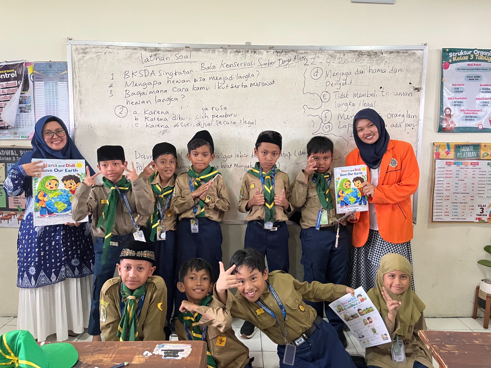 Sebelum pelaksanaan di kelas, tim dosen terlebih dahulu melakukan tahap persiapan dengan memberikan pelatihan kepada mahasiswa terkait teknik reading aloud dan dialogic reading. Pelatihan ini bertujuan agar mahasiswa mampu mendampingi siswa secara efektif selama kegiatan berlangsung. Cerita yang digunakan dalam pembelajaran adalah “Nana and Didi Save Our Earth” yang dipilih karena mengandung nilai edukatif cinta lingkungan dan relevan dengan kehidupan sehari-hari siswa.
