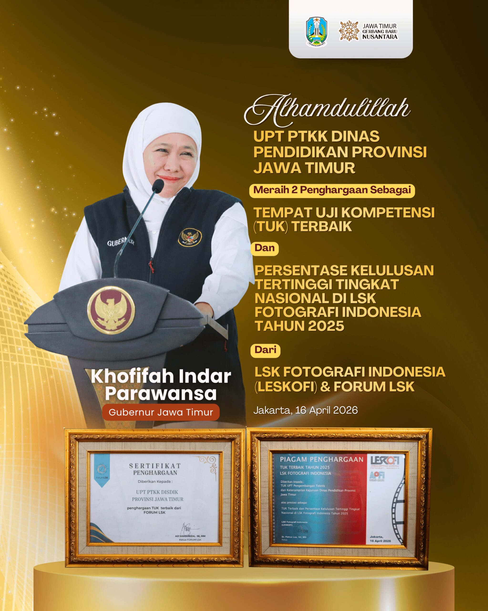 “Capaian ini bukan hasil instan, tetapi buah dari pembinaan yang terstruktur dan berkelanjutan. Ditambah pengakuan melalui penghargaan TUK terbaik, ini memperkuat bahwa ekosistem vokasi Jawa Timur berjalan konsisten dan on track,” ungkapnya.