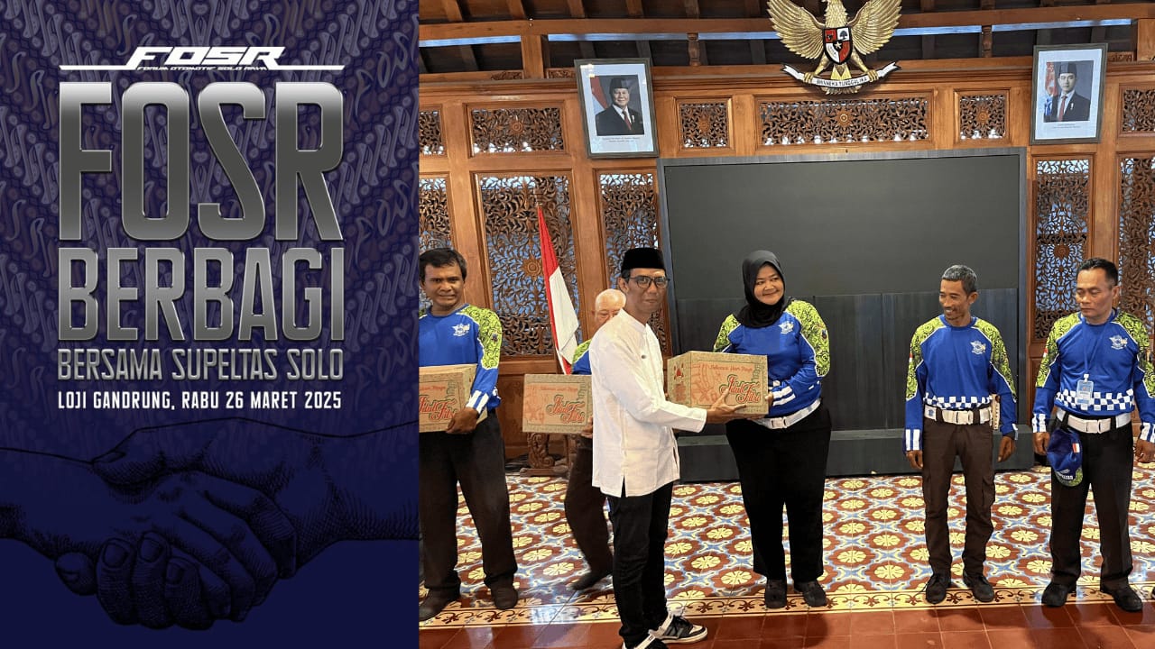 Media Bangsa – Forum Otomotif Solo Raya (FOSR) menggelar kegiatan sosial berbagi dan buka puasa bersama dengan para sukarelawan pengatur lalu lintas (supeltas) Kota Surakarta di Rumah Dinas Wali Kota Surakarta (Loji Gandrung) pada Rabu, 26 Maret 2025. Acara ini dihadiri oleh berbagai klub mobil di Solo Raya yang tergabung dalam FOSR, seperti Panter Mania, AAFI, HBC, JFC, W210, SRC, TVLC, dan banyak lainnya.