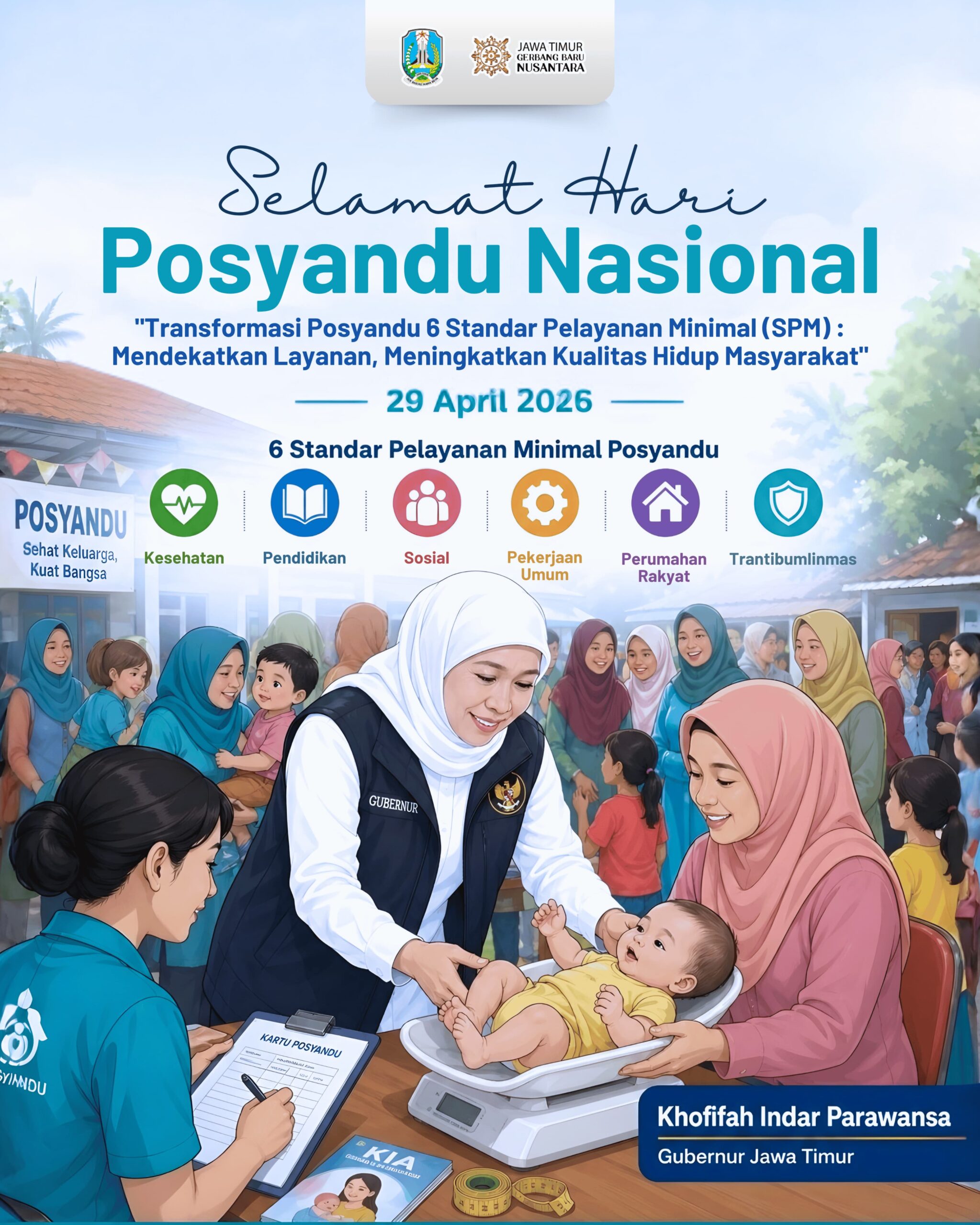 Menurut Gubernur Khofifah, Posyandu merupakan lembaga kemasyarakatan desa/kelurahan (LKD/LKK) yang memiliki peran strategis sebagai wadah partisipasi masyarakat sekaligus mitra pemerintah dalam perencanaan, pelaksanaan, hingga pengawasan pembangunan di tingkat lokal.