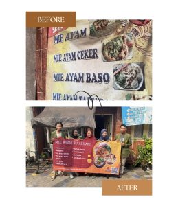 Selain itu, Pengembangan yang kami lakukan untuk Mie ayam Bu Ashari ini adalah mendesain ulang banner yang ada di depan warung Bu Ashari ini, Kami mendesain dan mencetak ulang agar lebih terlihat fresh dan menarik pembeli. Salah satu fungsi dari banner ini juga untuk media promosi karena kita buat dengan warna yang lebih cerah dan ukuran yang lebih besar agar terlihat oleh orang yang melintas di depan warung Bu Ashari.