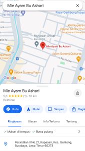 Disini kami membantu ibu Ashari dalam pembuatan Google Maps agar memudahkan para pelanggan untuk mencari alamat dari Mie Ayam bu Ashari ini karena lokasinya berada di dalam gang yang kecil dan belum banyak yang tau. Usaha ini kami lakukan agar kedepannya Mie Ayam Bu Ashari lebih diketahui banyak orang karena Google Maps bisa di akses oleh siapapun dan kapanpun dan juga agar lebih meningkat jumlah penjualan dari Mie Ayam Bu Ashari.