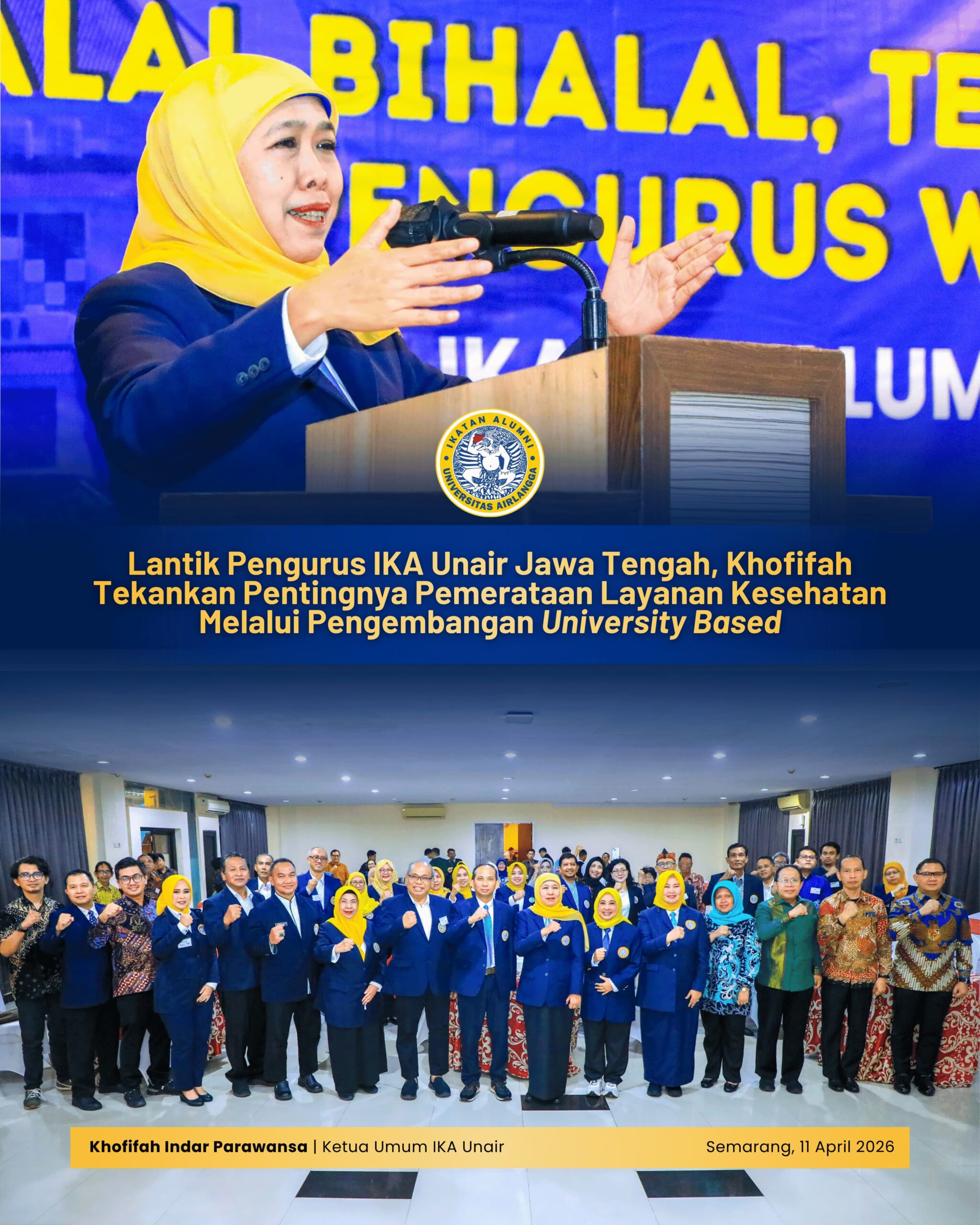 Media Bangsa – SEMARANG, 12 APRIL 2026, Ketua Umum Pengurus Pusat Ikatan Keluarga Alumni (IKA) Universitas Airlangga (UNAIR) yang juga Gubernur Jawa Timur Khofifah Indar Parawansa melantik Pengurus Wilayah IKA UNAIR Jawa Tengah di UTC Convention Hotel, Semarang, Sabtu (11/4).