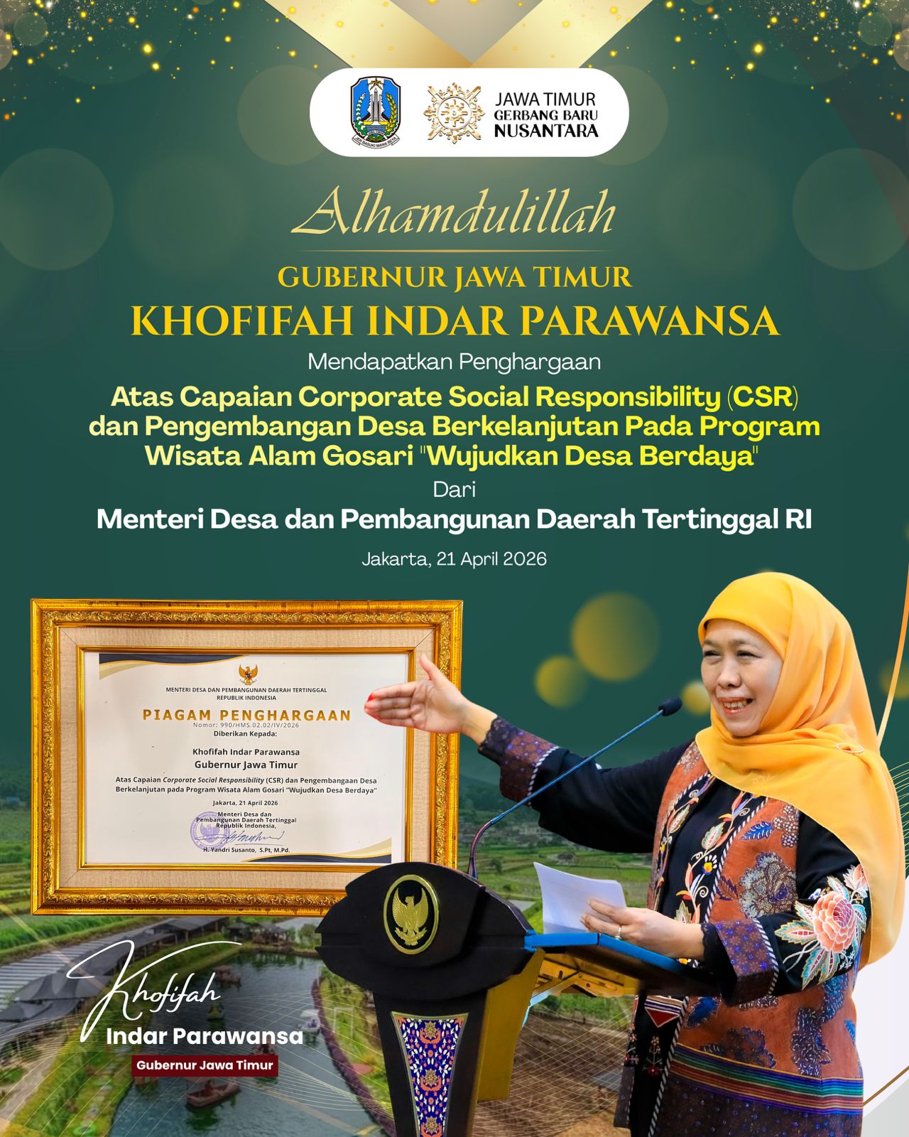 “Alhamdulillah kami menerima Penghargaan Corporate Social Responsibility (CSR) dan Pengembangan Desa Berkelanjutan (PDB) Award Tahun 2026 dari Kementerian Desa dan Pembangunan Daerah Tertinggal,” kata Gubernur Khofifah di Surabaya, Jum’at (24 /4).