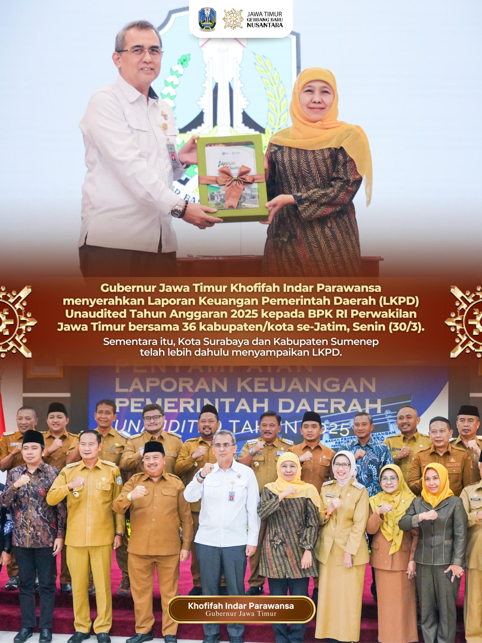 Media Bangsa – SIDOARJO, 31 MARET 2026, Gubernur Jawa Timur Khofifah Indar Parawansa menyerahkan Laporan Keuangan Pemerintah Daerah (LKPD) Unaudited Tahun Anggaran 2025 kepada BPK RI Perwakilan Jawa Timur bersama 36 kabupaten/kota se-Jatim, Senin (30/3). Sementara itu, Kota Surabaya dan Kabupaten Sumenep telah lebih dahulu menyampaikan LKPD.