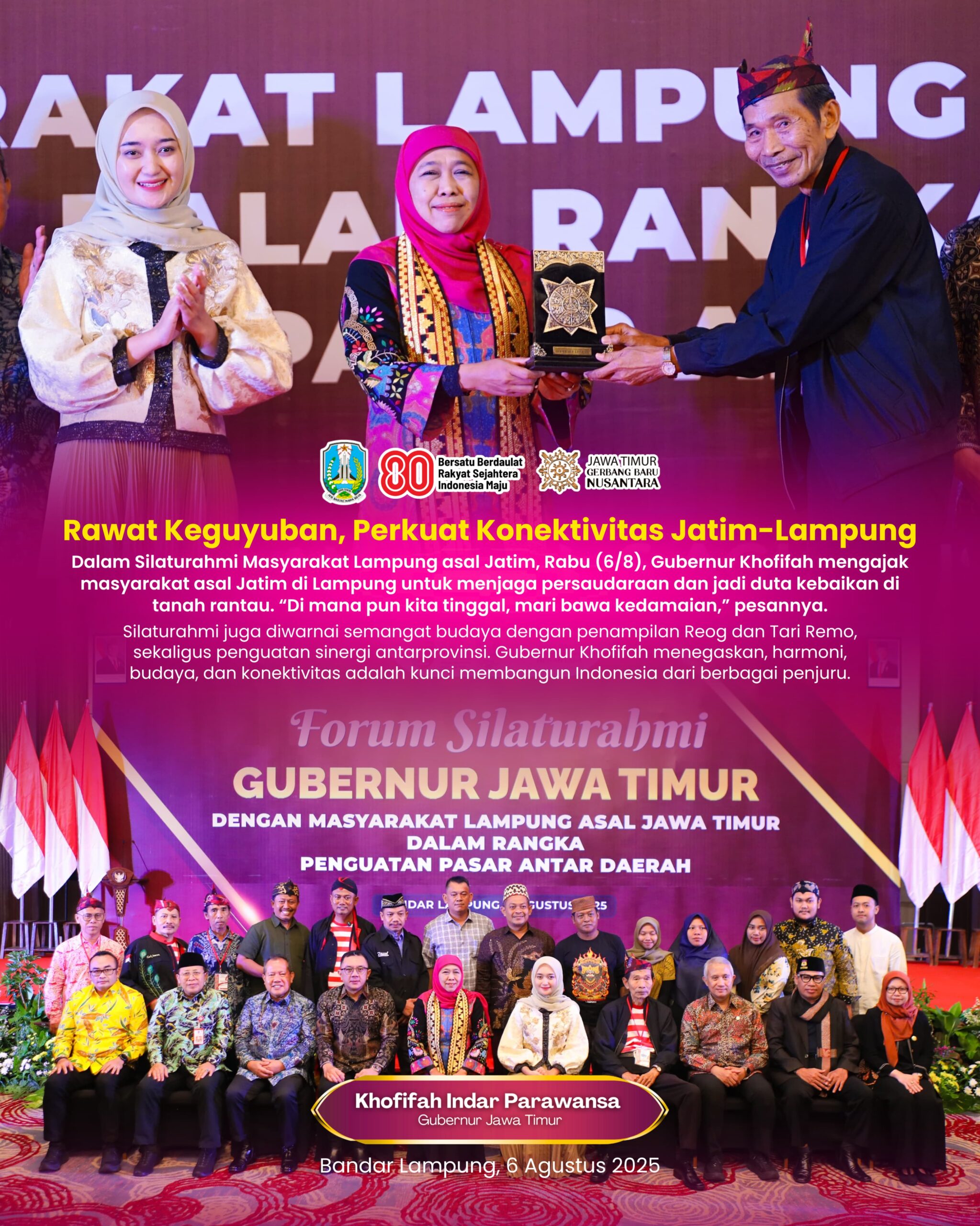 Media Bangsa – gubernur Jawa Timur Khofifah Indar Parawansa mengajak masyarakat Lampung asal Jatim untuk terus menjaga keguyuban, mempererat persaudaraan, serta menjadi teladan hidup damai dalam masyarakat yang majemuk.