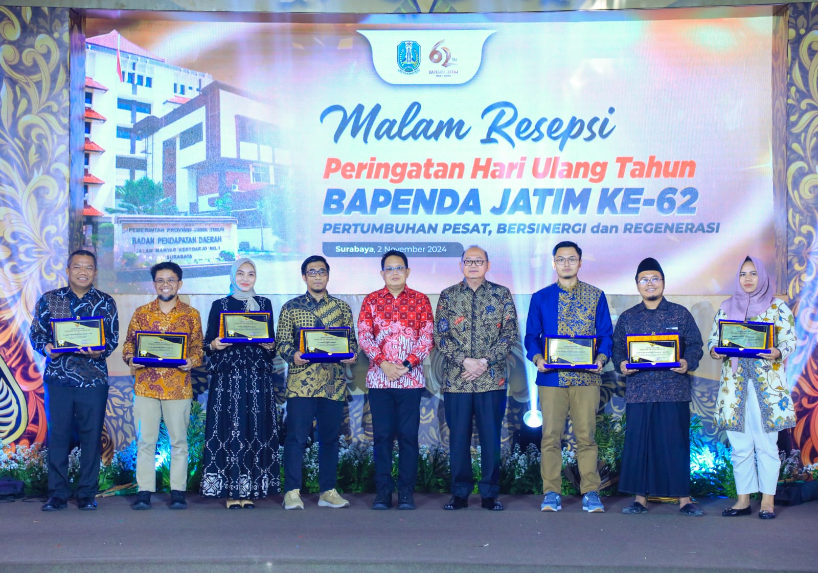 Dalam HUT Bapenda Jatim ke-62 kali ini, turut diserahkan berbagai macam penghargaan diantaranya Mitra Kerja, Tertib Administrasi Kinerja UPT PPD, Kontribusi Wajib Pajak Patuh hingga penghargaan atas kerjasama dan dukungan sinergitas berbagai mitra Bapenda Jatim lainnya.