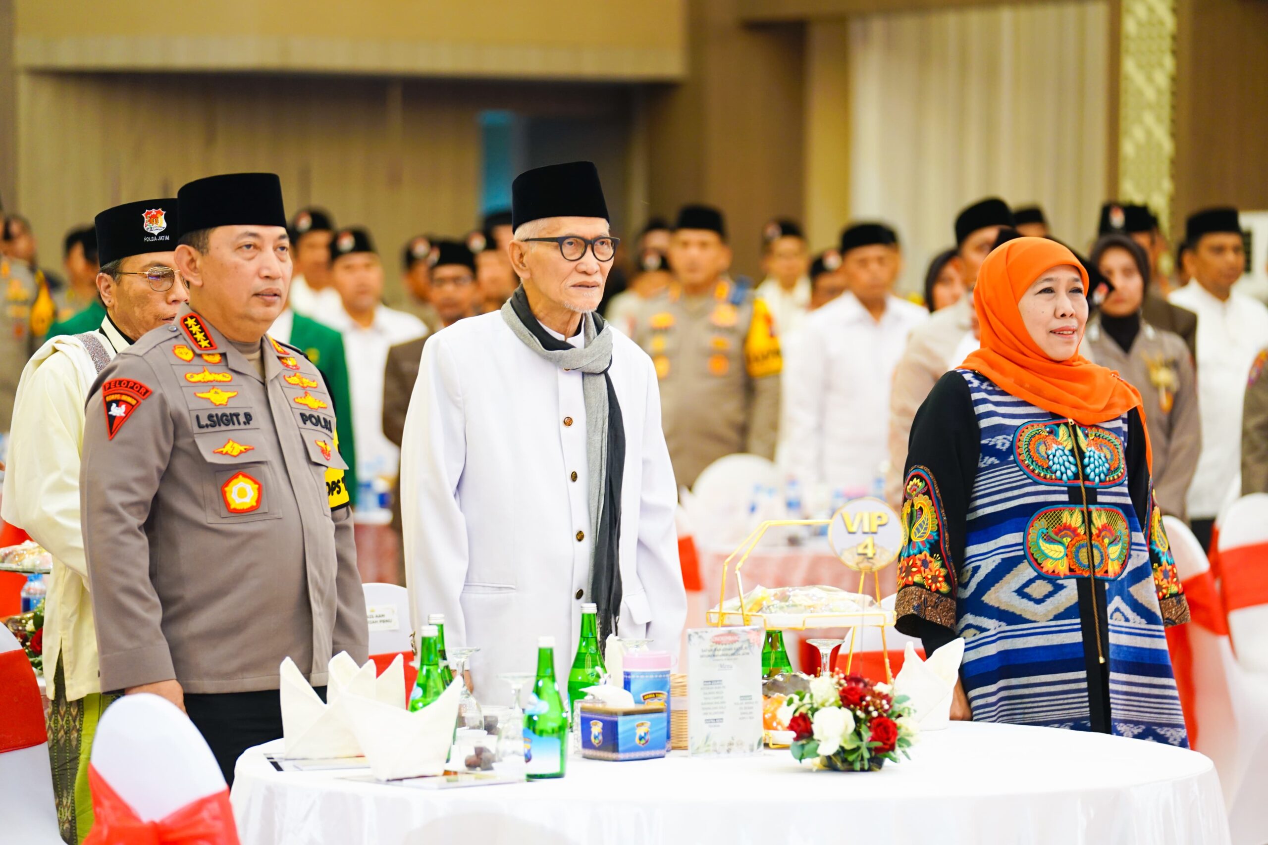 Media Bangsa – Gubernur Jawa Timur Khofifah Indar Parawansa bersama Kapolri Jenderal Pol Listyo Sigit Prabowo, Kapolda Jatim Irjen Pol Nanang Novianto, sejumlah Ulama dan Elemen Masyarakat buka puasa bersama Ulama dan Elemen Madyarakat Jawa Timur bertajuk Safari Ramadhan di Gedung Mahameru, Mapolda Jatim, Surabaya, Kamis (20/3).