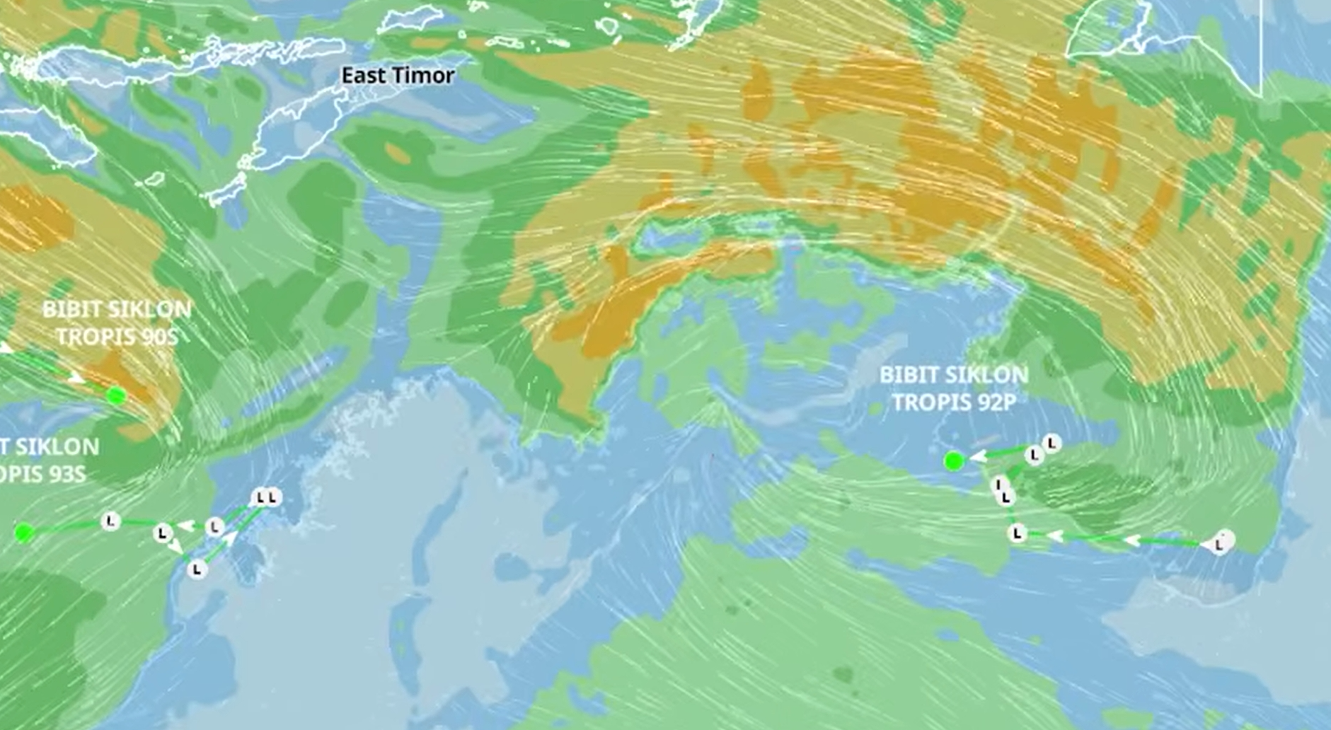 Sementara itu, bibit siklon tropis 93S terpantau berada di perairan barat Australia Barat dan bergerak ke arah barat hingga barat daya dengan intensitas diperkirakan berada pada kategori sedang dalam dua hingga tiga hari ke depan.