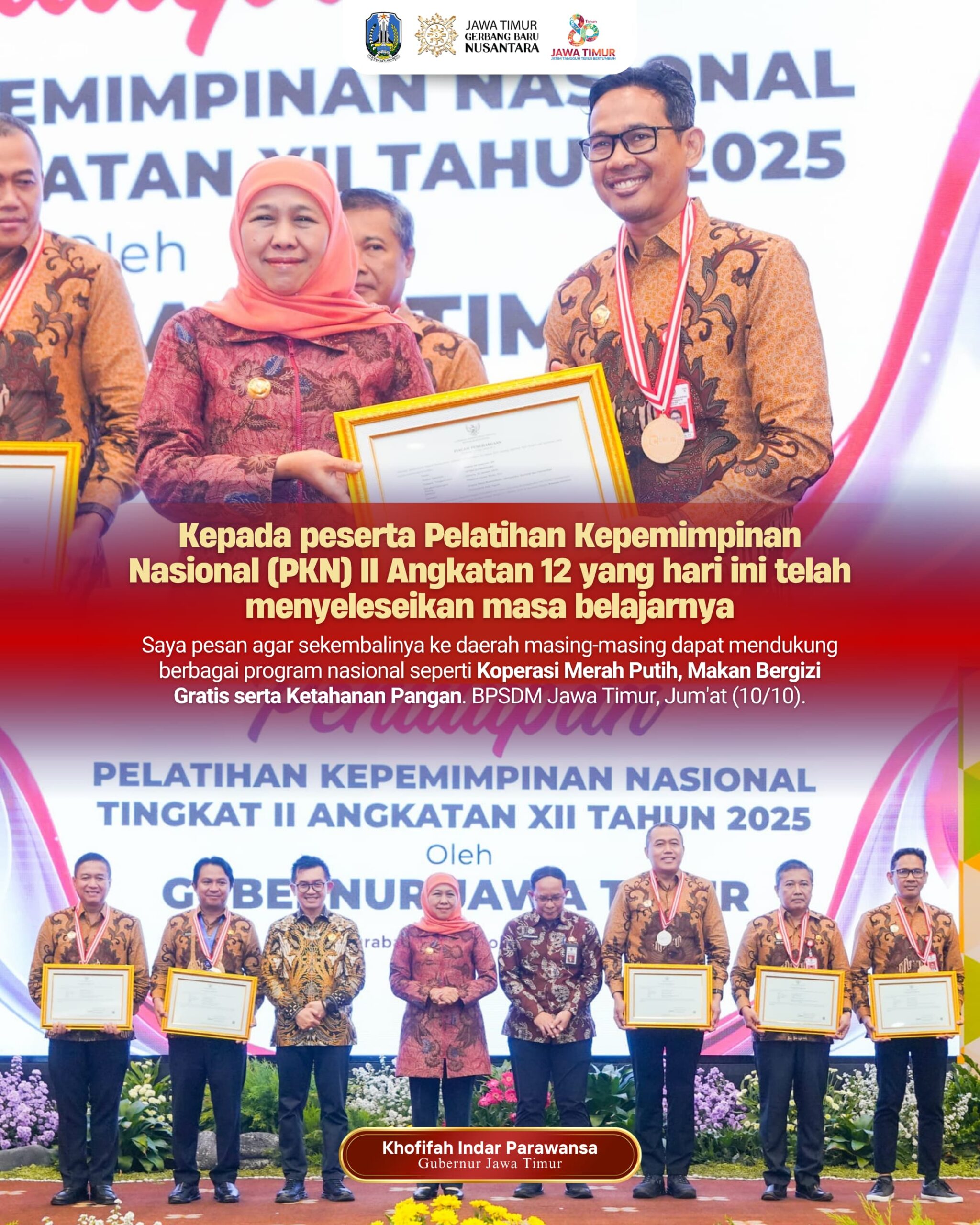 Media Bangsa – SURABAYA, 10 OKTOBER 2025, Gubernur Jawa Timur Khofifah Indar Parawansa menutup kegiatan Pelatihan Kepemimpinan Nasional (PKN) Tingkat II Angkatan XII Tahun 2025 di Badan Pengembangan Sumber Daya Manusia (BPSDM) Provinsi Jawa Timur, Jumat (10/10).